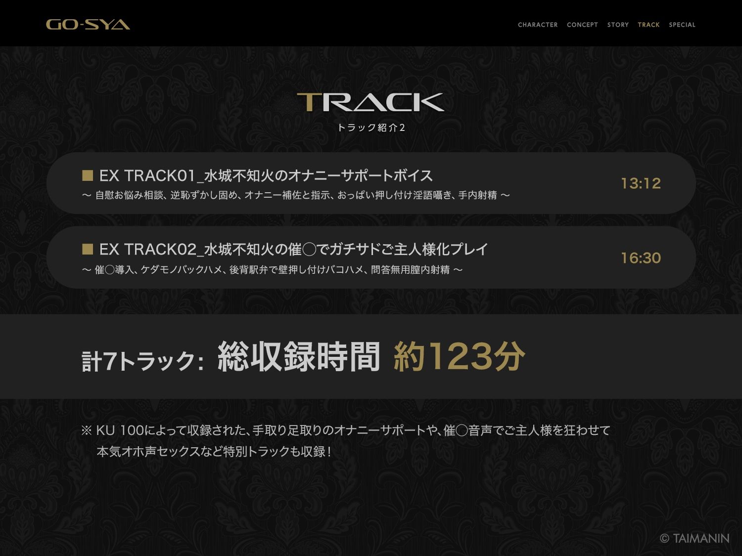 KU-100によって収録された、手取り足取りのオナニーサポートや、催◯音声でご主人様を狂わせて本気オホ声セックスなど特別トラックも収録!